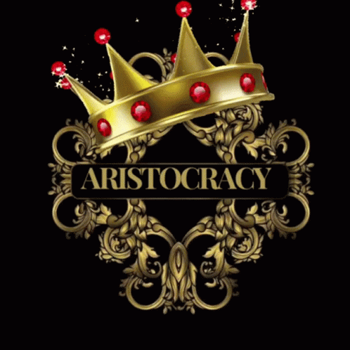 A sparkling golden crown adorned with red jewels sits above an elegant emblem featuring the word 'ARISTOCRACY'.