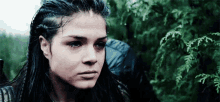Octavia Blake, portrayed by Marie Avgeropoulos, crying with a bruised eye in a somber forest setting.
