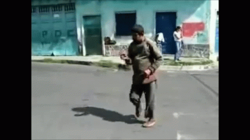 Man performs 'Cucarachas Borracho' dance moves in the street in front of a building marked 'PDC'.