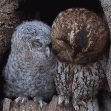 Two adorable Tawny Owls, observed by Robert E Fuller, are seen cuddling and resting together in a tree hole.
