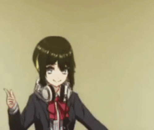 Maho Akashi from D4DJ, wearing headphones, dances energetically with a microphone, making funny expressions.