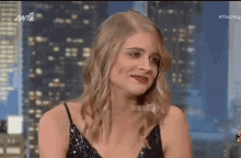 Danae Michalaki from Agries Melisses laughs heartily in a black sequined top against a city skyline background.
