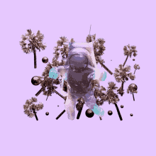 Last Lauf's purple astronaut dances and floats among palm trees and spheres in a vibrant, surreal space.