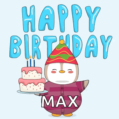 A cute animated penguin in a party hat holds a birthday cake for Max, with 'Happy Birthday' text.
