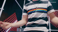 Ludovico Tersigni dancing energetically at Xfactoritalia, wearing a black and white striped shirt with a rainbow.