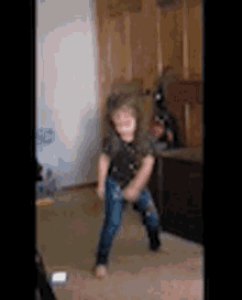 A little girl with long hair performs funny and energetic dance moves in a living room.