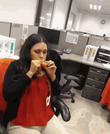 Dania sitting in an office cubicle, blowing up an orange balloon with a lanyard around her neck.