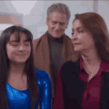 Danielaromo, in a shiny blue leotard, smiles and gives a thumbs-up, with an older woman and man smiling nearby.