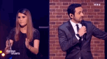 Combal and Karine Gferri on stage during Danse Avec Les Stars, holding microphones and interacting with the audience.