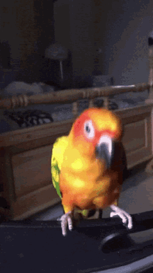 David Coco, a vibrant yellow and orange parrot, bobs its head playfully.
