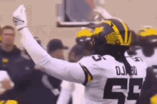 David Ojabo, a football player wearing jersey number 55, raises his arms in celebration on the field.