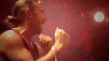 A man dancing energetically in a dark, red-lit setting with "DAYUM" text visible.