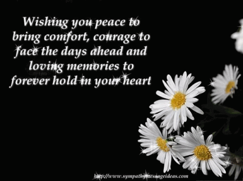 A heartfelt sympathy message with white daisies on a black background, offering comfort and peace.