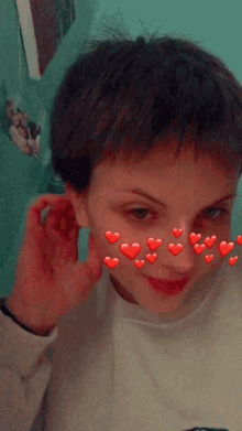 Debby Chiara smiling with a heart face filter and touching her ear, against a teal background.