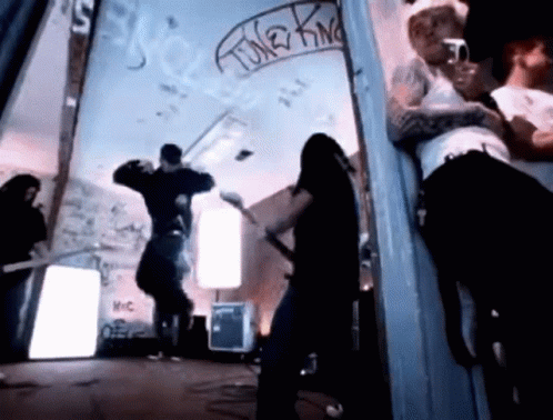 Deftones band members energetically performing their music in a room with graffiti on the walls.