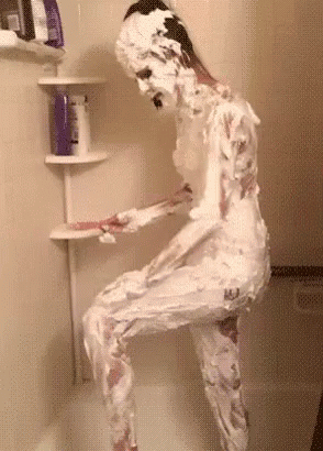 A person covered in shaving cream from head to toe in a shower stall, meticulously shaving their legs.