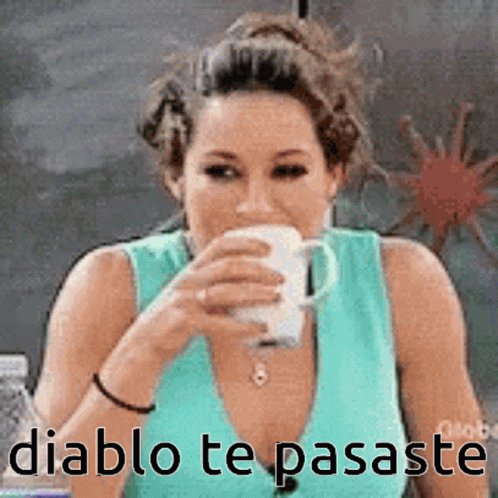A woman drinks from a mug, reacting with a laugh as the text 'diablo te pasaste' appears.