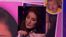Diane Youdale, known as Jet, smiles while holding a picture of a man, with another man's image in the background.
