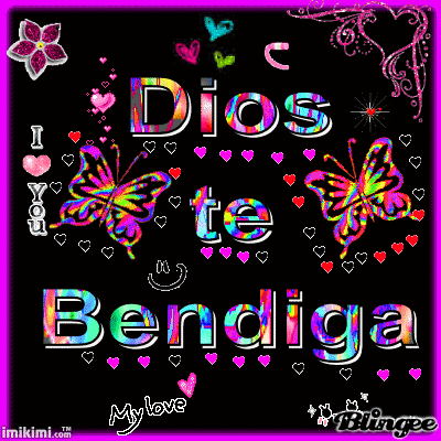 An animated greeting featuring "Dios Te Bendiga" with colorful butterflies and hearts on a black background.
