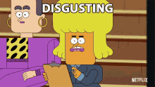 Ms Hilltop, voiced by Amy Sedaris, reacts with disgust while Principal Pfunne, voiced by Colleen Smith, is in the background.