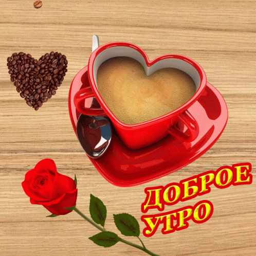 Heart-shaped coffee cup, red rose, and coffee beans on a wooden background with 'Good Morning' text.
