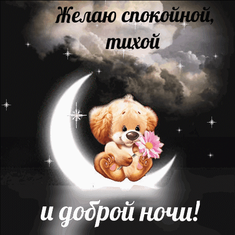 An animated greeting card wishing a calm, quiet, and good night, featuring a teddy bear on a crescent moon.