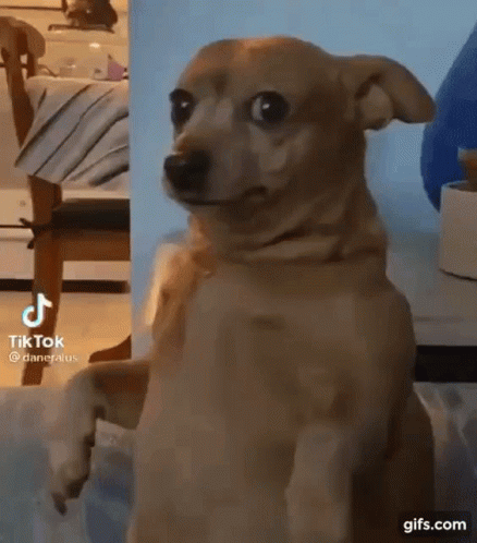 Small brown dog standing on its hind legs, looking tense and suspicious with wide eyes.