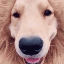 Close-up of a happy golden retriever wearing a lion's mane costume, smiling at the camera.