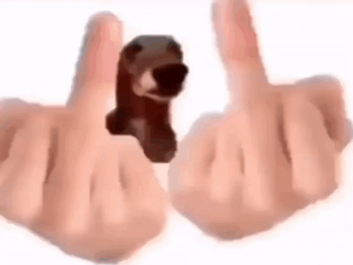A humorous meme featuring a dog-like figure positioned between two hands giving the middle finger, with Portuguese text.
