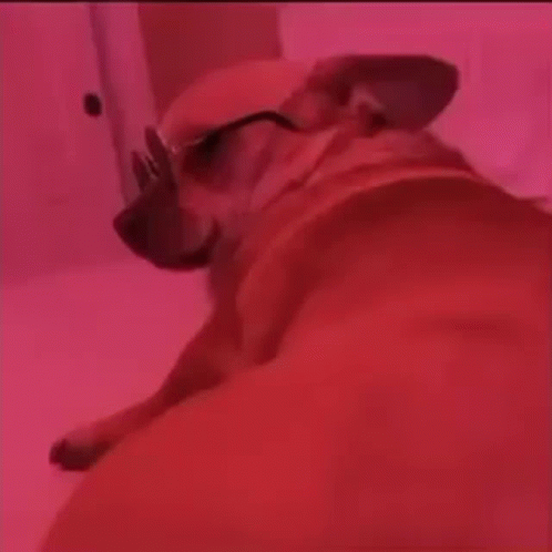 A cool dog Perrito wearing round sunglasses, relaxing on a bed with changing colored lights.