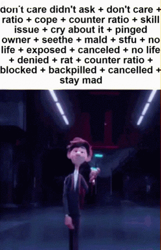 Animated character from Spies in Disguise reacting to the 'Don't Care Didn't Ask Cope' meme with a dismissive gesture.