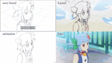 See the animation process from storyboard to final render, featuring a cute anime girl and a rainbow scene.