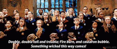 The Hogwarts choir from Harry Potter sings 'Double, double toil and trouble' with their animal companions.