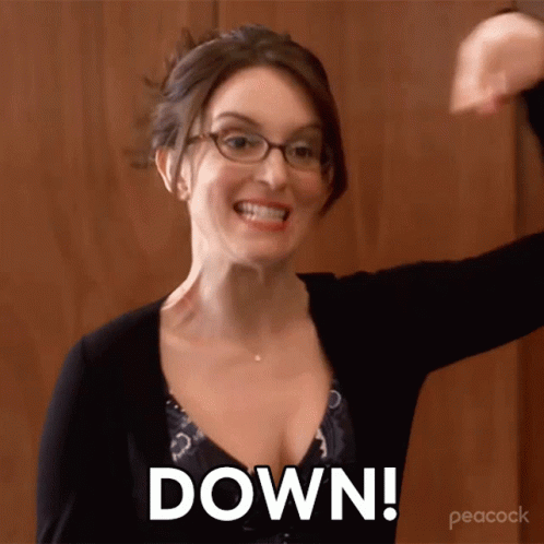 Liz Lemon, played by Tina Fey, emphatically points downwards and exclaims 'DOWN!' in a memorable moment from 30 Rock.