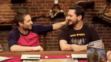 Chris Hardwick playfully squeezes Will Wheaton's cheek during a Dragon Age tabletop game session.