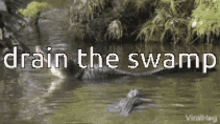 A crocodile swims in a murky swamp, with the text 'drain the swamp' prominently displayed over the scene.