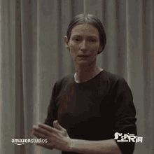 Dakota Johnson in a dramatic scene from Suspiria, standing still in a large hall, with Tilda Swinton also featured.