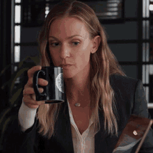Jennifer Jareau (AJ Cook) sips from a black mug, wearing a suit in Criminal Minds Evolution.