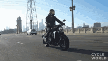 A man rides a Honda CB1000R motorcycle across a bridge with a city skyline, featured by Cycle World.
