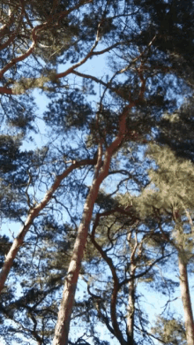 Looking up at tall green trees reaching towards a clear blue sky, showcasing a peaceful natural scene.