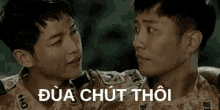 Song Joong Ki and Jin Goo in military uniforms, sharing a light moment with the caption 'Just kidding'.