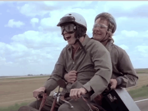 Lloyd Christmas (Jim Carrey) and Harry Dunne (Jeff Daniels) joyfully riding a mini-bike in Dumb and Dumber.
