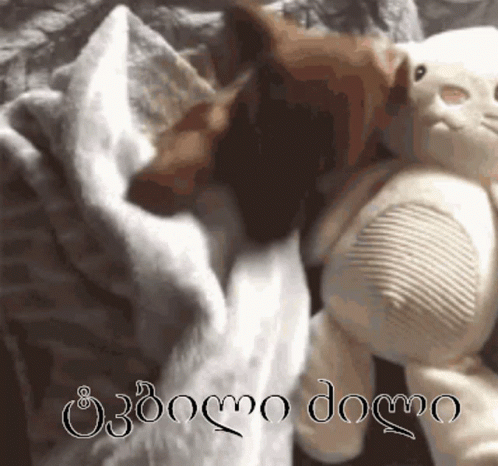 A cozy brown dog wrapped in a blanket, sleeping peacefully next to a white stuffed animal, with 'Sweet dreams' text.