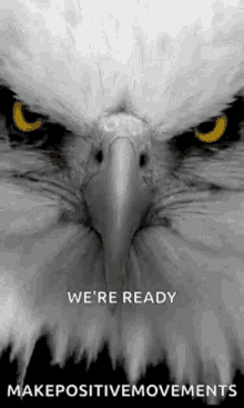 Close-up of an animated bald eagle with intense yellow eyes, displaying the text 'WE'RE READY'.