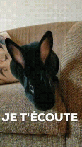 A black rabbit sits attentively on a couch, with the caption 'I'm listening' displayed.