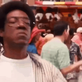 Eddie Murphy, as a character from Norbit, dances energetically in a lively crowd at a carnival.