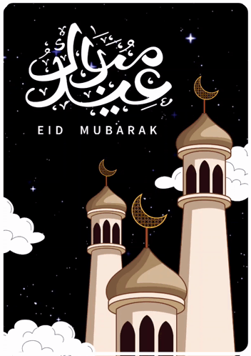 Animated greeting card wishing 'Eid Mubarak' and 'El-al-fitr' with mosque minarets under a starry night sky.