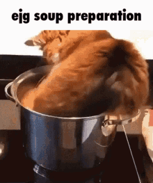 A fluffy cat is comically preparing "ejg soup" by sitting inside a large cooking pot.