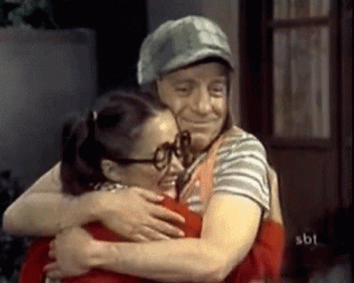 Chavo from El Chavo Del Ocho shares a warm hug with Chilindrina, who is wearing glasses.