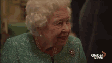 Queen Elizabeth II smiles warmly, adorned in a green dress and pearls, during an event.